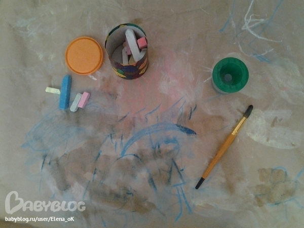 На серой бумаге мелкАми рисуем все, что придет в голову (в основном, на тему прогулки), а затем кисточкой-водичкой смываем, потому как "дождик пошел и все убежали". :)