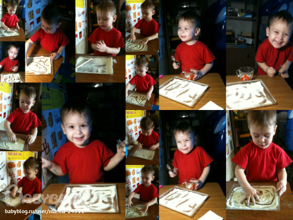 Игры и игрушки для детей от 2х-до 3-х летКак же нам понравилось работать с манкой! Что-то мы про нее совсем забыли... А тут решили открытки сделать бабушкам к 8 марта, а потом решили просто порисовать))) потом вход пошли:кисточки, карандаши в роли дворников (машина), катали как скалкой, крутили. рисовали одновременно 2-мя кисточками/карандашами/пальчиками... потом ложечкой насыпали в/из чашечку))) кормили, поили, при помощи ложки насыпали горы и горочки))) вобщем провозились мы с ней около часа!!!!!
