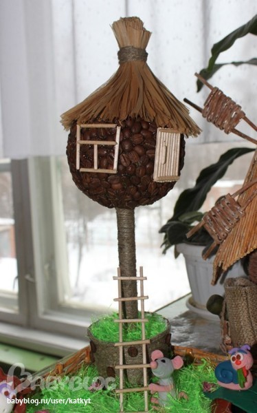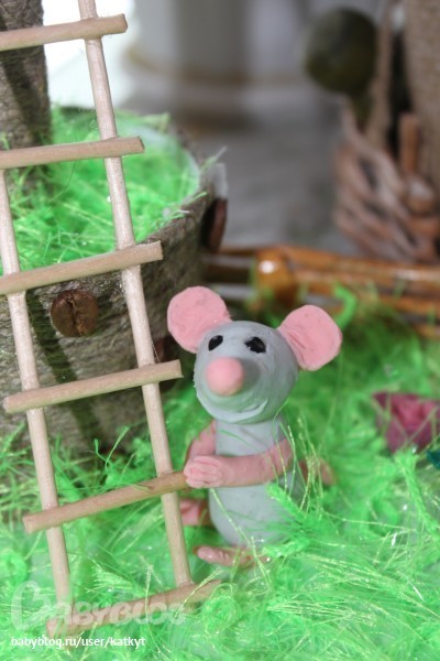 Звери все из пластилина :))) Лесенка у мышек из деревянных шпажек (знаешь, такие для домашних шашлычков продаются?), Кофе и окна и дверька там ещё торчит и травку - клеила на клей Титан. Травка - из пряжи "травка", измельчила и посыпала на клей
