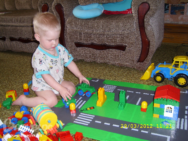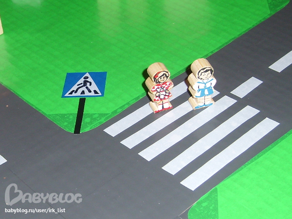 Сделала давно задуманную дорогу. Светофоры от конструктора "Томик" очень удобно поварачивать, то красный цвет (на двух гранях), то зеленый (на двух других). Ездили и ходили по сигналам, пропускали пешеходов на зебре.