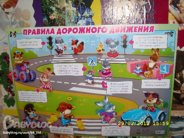 Плакат. Мне не очень понравилось, что зайка девочка на красный свет встала посреди дороги (мы это обсудили), и в нижней части все заняты тем, что нельзя: не играй на дороге, не беги через дорогу. Отрицательная частица плохо воспринимается. Но другого не было, ребенок доволен!