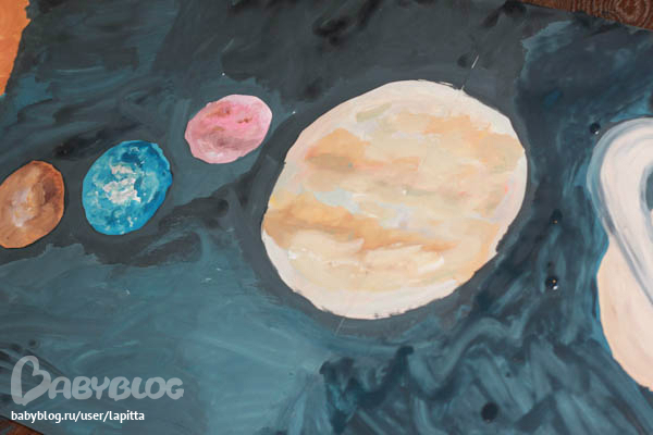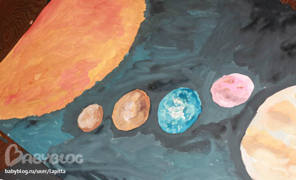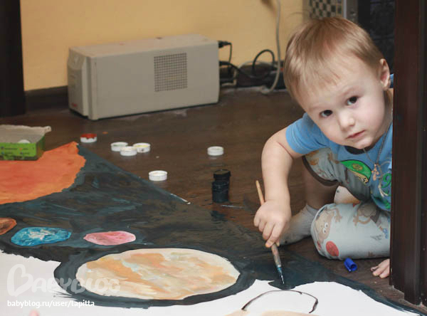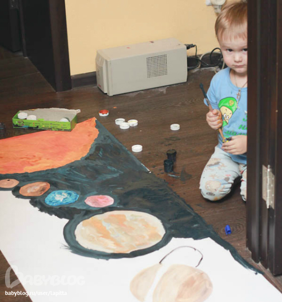Склеили мы 2 ватманата. Карандашом я набрасала местонахождение планет и мы взяли гуашь и начали творить. Солнце я полностью отдала на растерзание Платону. Так как он обожает оранжевый цвет и любит его перемешивать и красить. Показала ему границы и он сам полностью его закрасил. Мелкие планеты красила сама, а вот те что покрупнее Платон помогал добавляя белой краски. Ну и конечно сам космос темносиний делал он сам. Опять же обозначила темным контур у планет и он полностью погрузился в рисование:)))