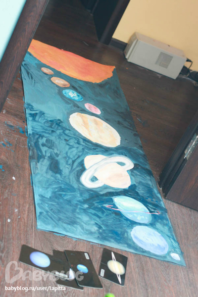 Художка ( красим, рисуем , придумываем новые способы рисовать)Теперь и у нас в доме появился космос. Давно хотела купить плакат с планетами, но у нас в городе ничего так и не нашла. А так как Платон знает все планеты и очень любит книги про космос и планеты, то мы решили сделать вот такой полномасштабный плакат. А еще мы нашли для этого плаката подходящее место. На чердаке верхней кровати.