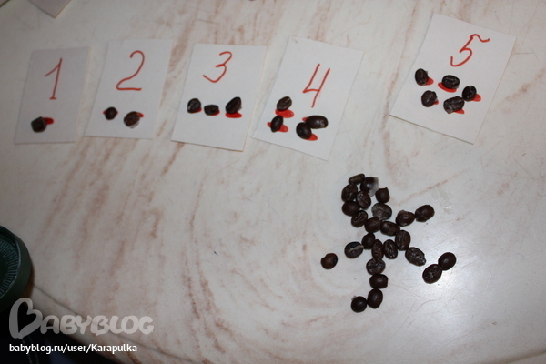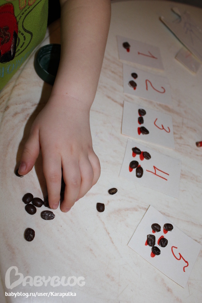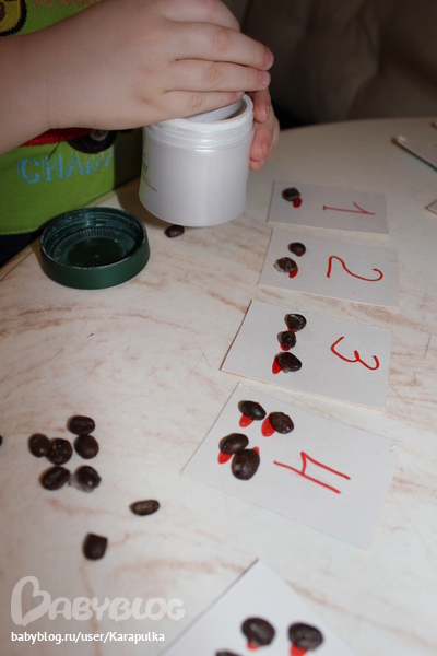 Таня за подкинутые идейки про игры на счёт . Сегодня вот с Дрюнькой придумали игру. Нарезали карточек и использовали в качестве счётного материала зёрнышки кофе. Нам очень запах нравится. Сидели балдели с ним. Нюхали и заодно считали)))