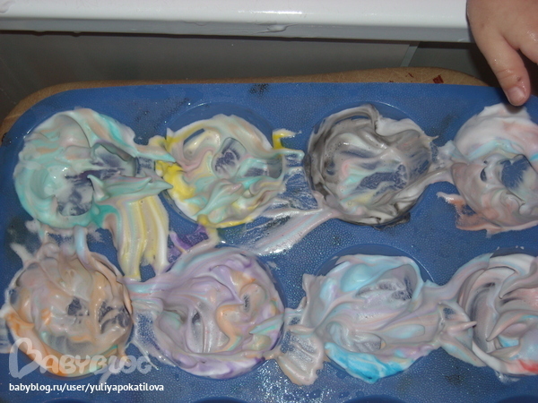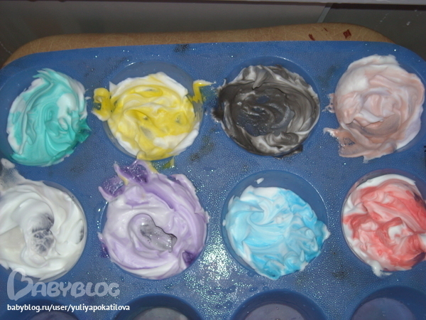 В силиконовые формочки выдавливаем пену для бритья, после красим ее акварельными красками в разные цвета: