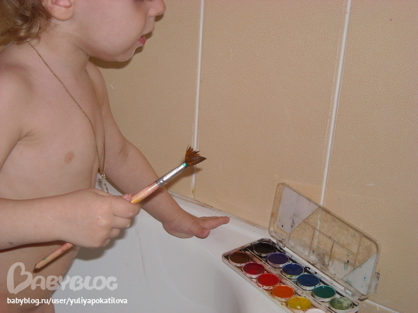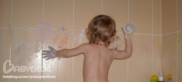 После сын ложкой выскребал остатки пены, брыгзал на покарашенные стены из пульвелизатора, смотря, как кусочки пены сползают, и, наконец, сам все смыл со стен душем. Так что игра с цветной пеной оказалась очень веселой, творческой и легко убираемой :)))