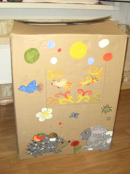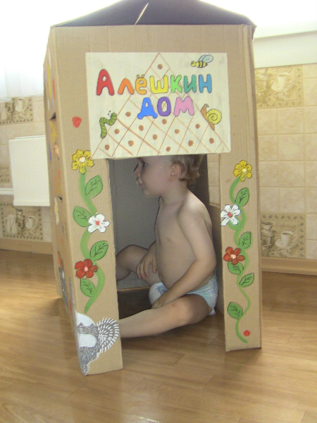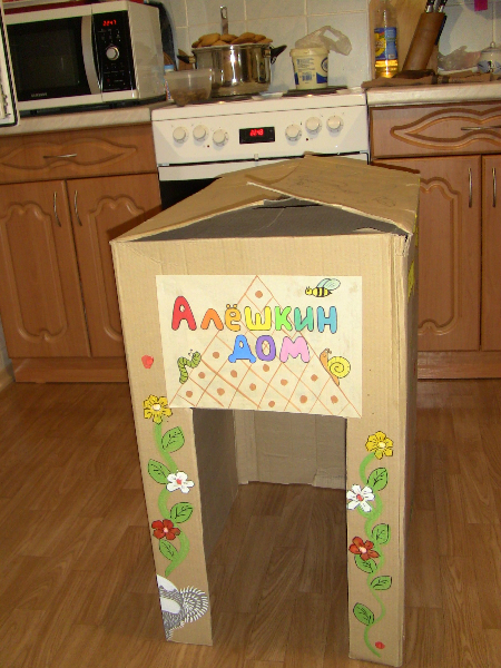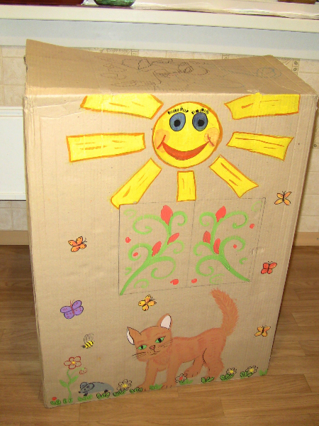 Самодельные игрушкиВот такой домик сотворился из коробки. А понадобилось всего-ничего: коробка, немного фантазии и свободного времени. Счастью сына нет предела, очень любит там играть, особенно кошку первую в дом запускать.... почему-то через окно