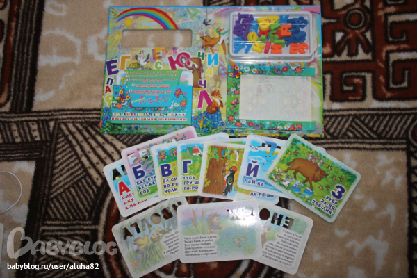 Внутри книги сделан кармашек для карточек и рамочка куда она вставляется. На этих карточках крупным шрифтом написана буква и слова начинающиеся с этой буквы. Также вверху карточки, как точнее написать, вырезано слово, начинающееся с буквы на карточке. В результате чего малыш берет буковки из другой коробочки и вставляет их (как пазл).