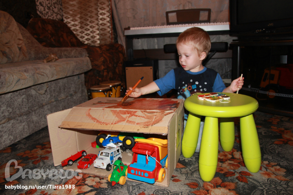 Делали гараж дя машины из коробок и раскрашивали его, дорисовывали двери !