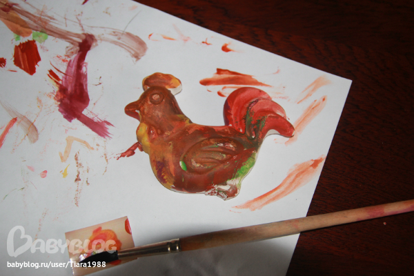 Одно из любимых занятий -раскрашивание гипсовых фигурок! Потом Данька такими фигурками играет долго! Для петуха потом мы нарисовали на бумаге поле, травку, цветочки, зернышки!