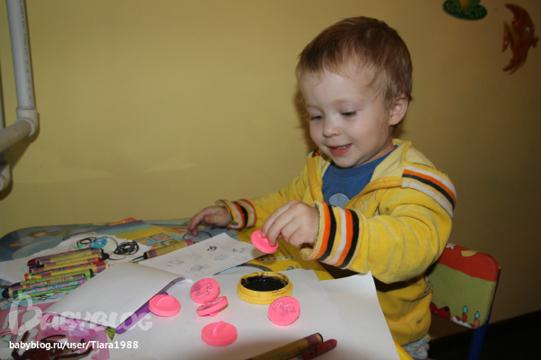 Данька очень любит штамповать, у нас еще есть другие штампы из губок и деревянные, фото выложу потом!