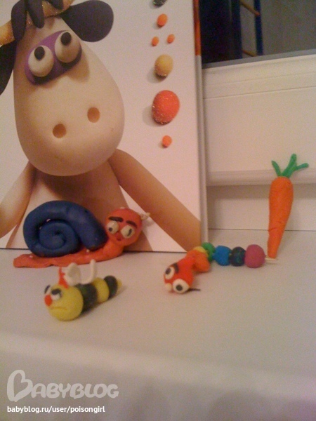 А это мы буквально вчера лепили букашек-таракашек из пластилина по книжке на заднем фоне (отличная книга, саму увлекает)