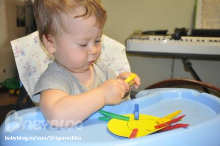 Солнышко из прищепок. Пока не научился сам одевать прищепки, но чуть чуть нажимаем. А еще я обнаружила что большая половина прищепок куда то пропала))) Поэтому солнышко такое бледненькое.
