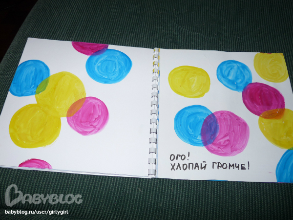 рисовала я гуашью фирмы ашан в тюбиках- у них очень яркие и сочные цвета, при этом цена радует ( я беру её сыну в дополнение к пальчиковым краскам), маленькие кружочки ставила самодельными штампиками, а большие - кисточкой
