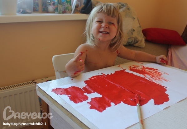 Мой ребенок гуашь очень любит - но с раннего детства мы стараемся/учимся рисовать ей аккуратно: