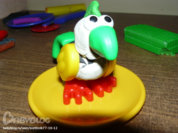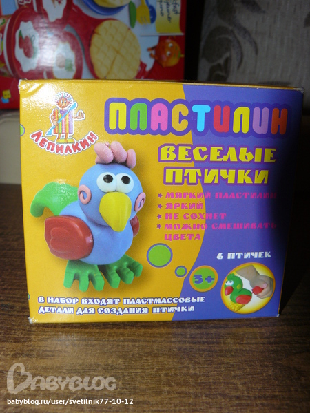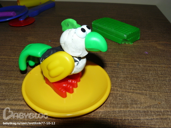 Мистер Умелец или Очумелые ручки (поделки, аппликации, интересные находки, идеи и задумки)Вот такой чудесный наборчик мы купили в "Кораблике". Делается правда легко и быстро,но эти 10 минут удовольствия ,очень даже подняли настроение,и после лепки ещё играл в птичку с час наверное. Сначала лепится туловище и голова,потом вставляются пластмассовые глаза,лапки,хвост и крылья. Гребешок тоже судя по картинке должен быть пластмассовый,но его в наборе почему то не оказалось,пришлось лепить из пластилина. Просит ещё. Купим потом ещё и другую птичку.