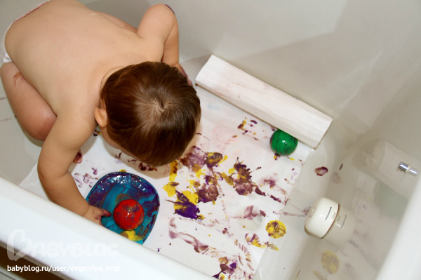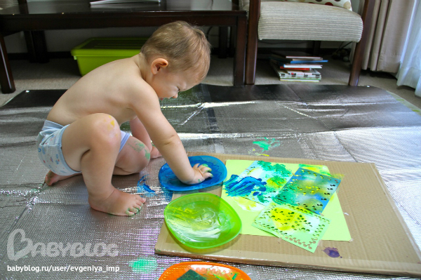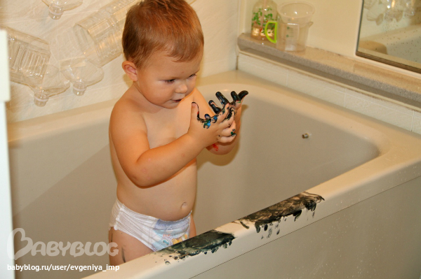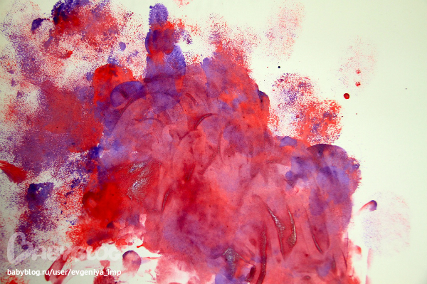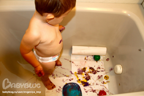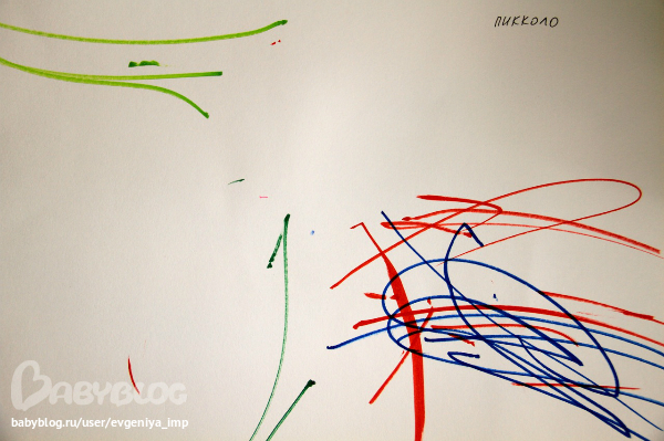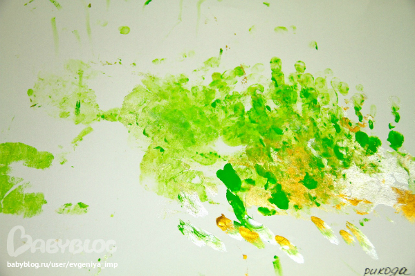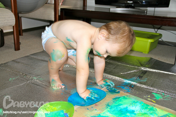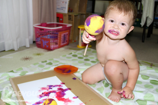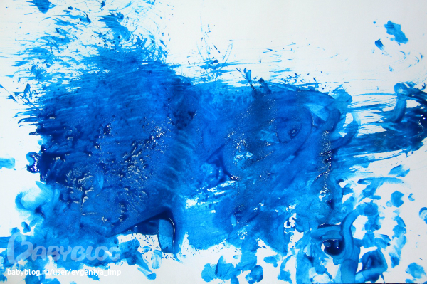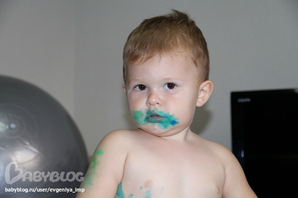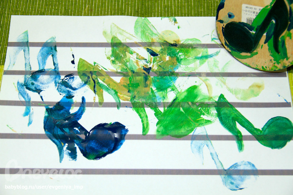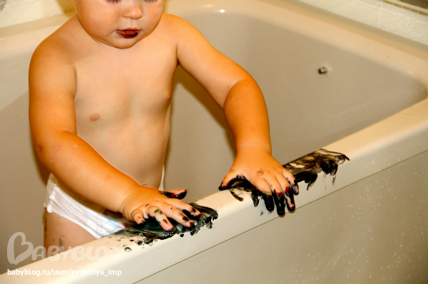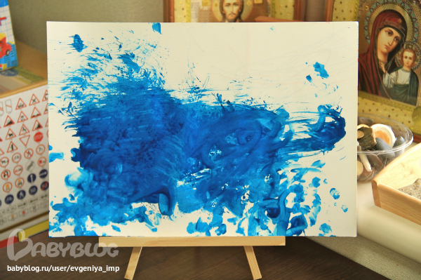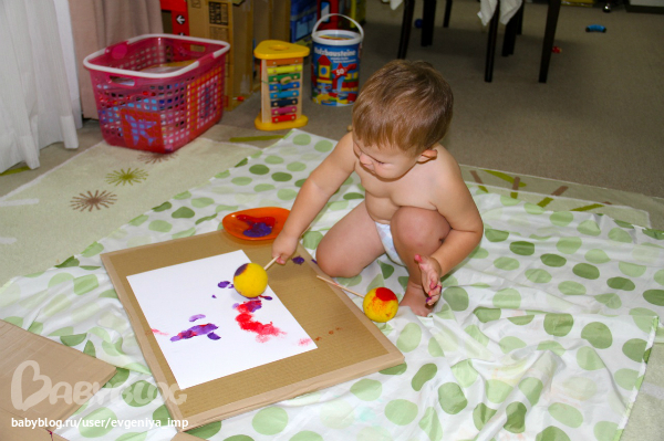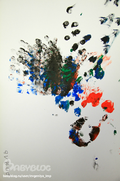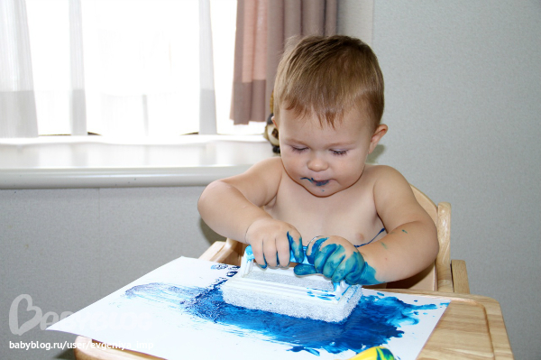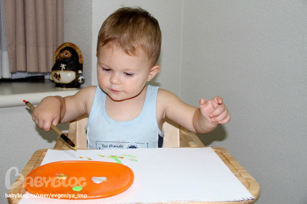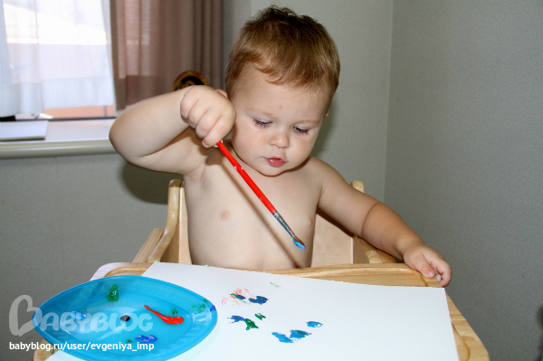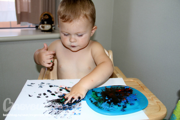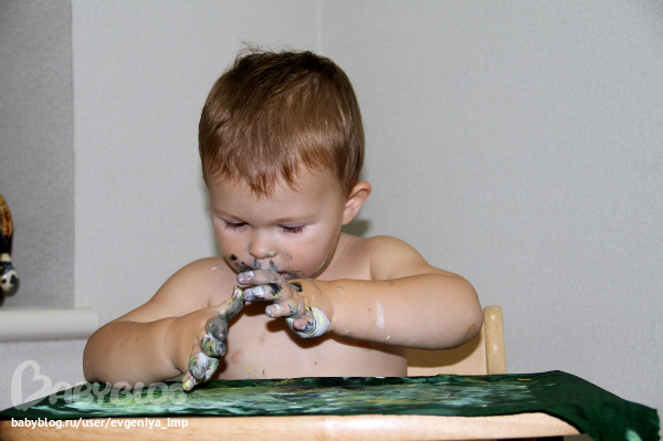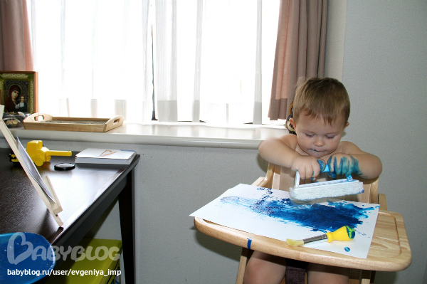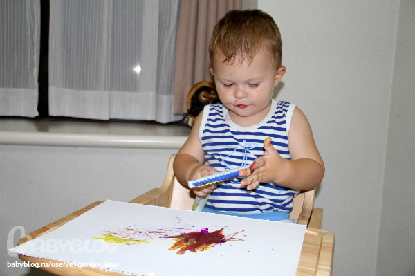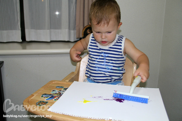 Рояль. Простая кисть. Сначала Даня старается делать мазки кисточкой, потом протягивает мне и говорит, что будет рисовать пальцем, а потом всей рукой.