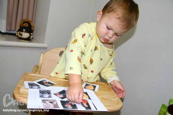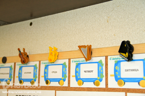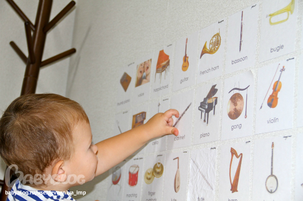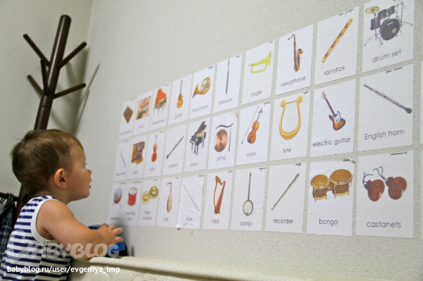 С самого начала у нас появилась вот такая стена с музыкальными инструментами. Через какое-то время Даня стал срывать некоторые картинки (они на самоклейке) и бежать ко мне, выкрикивая название инструмента. Я приклеивала ее куда-нибудь подальше: на спину, на ноги... Он пытался оторвать, а я при этом повторяла название инструмента. Он веселился и тем самым очень хорошо запоминал все.