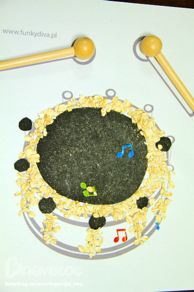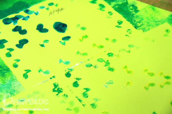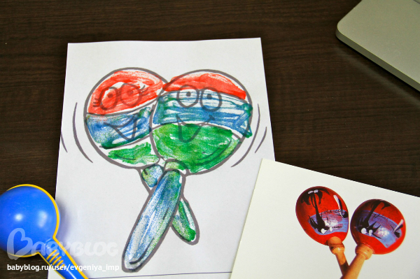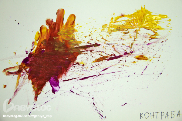 На этот раз у Дани была полная свобода выбора. Я давала ему стопку карточек, он выбирал одну. Я включала музыку с этим инструментом. Пока она звучала, Даня выбирал цвета красок. Вернее он их просто начинал вынимать из коробки, а я останавливала на первых четырех, и мы шли рисовать. Старалась подобрать под каждый инструмент какое-то свое орудие для изображения. Кажется неплохо получилось. Разные фактуры и разные техники.