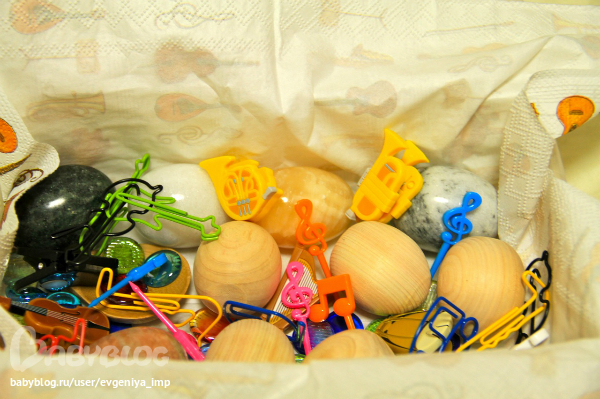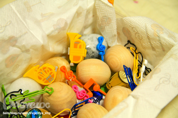 Тематическая коробочка. В ней были магнитики, которые так же участвовали у нас в информационной доске. Положила в коробочку каменные и деревянные яйца. Дане понравилось проверять, как звучат разные яйца: звонко или глухо.