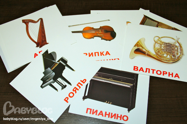 Японские карточки шли вместе с диском. К каждой карточке прилагается музыкальная дорожка, где инструмент называют, рассказывают про него и дают послушать произведение, где ему отводится главная партия. Единственный минус - это все на японском. Если это вас не смущает, вот тут можно скачать эти карточки вместе с музыкальными дорожками.