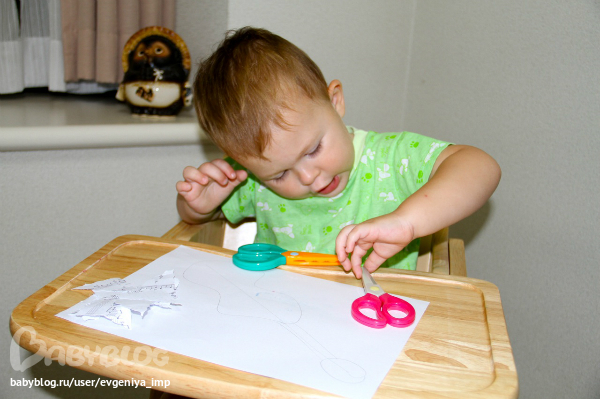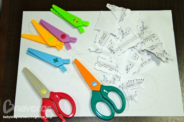 Гитара. Аппликация из нот. Даня попробовал сам вырезать детскими ножницами. Подержал, покрутил и сказал, чтоб я сама все вырезала.
