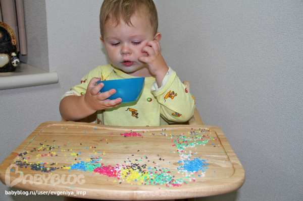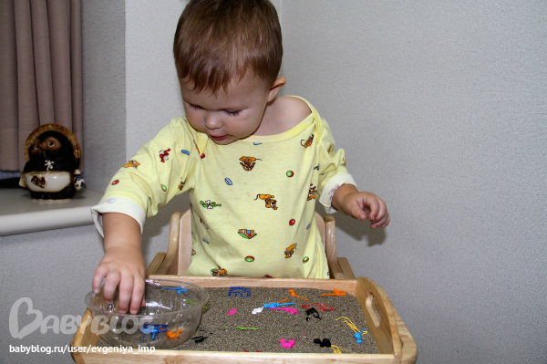 Когда коробочка себя исчерпала, я ее трансформировала в сенсорную коробочку с песком, который насеяла на пляже. Это был наш фаворит. Даня мог по несколько раз перекладывать все предметы туда-сюда. Либо я должна была называть эти предметы, либо он сам это делал. Заканчивалось все моей приборкой с пылесосом. А сама коробочка закончилась, когда в ней почти не осталось песка. На самом песке тоже рисовали долго и интересно.
