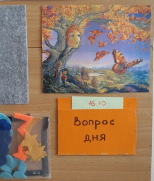 В правой части картина на тему сезона и вопрос дня. Я решила таким образом сделать вопросник для доченьки, сохранять карточки с ответами и потом посмотреть изменения в предпочтениях. В качестве вопросов темы у нас разные - как о личных предпочтениях, так и об окружающем мире, периодически вопросики в рамках проводящейся ТН.