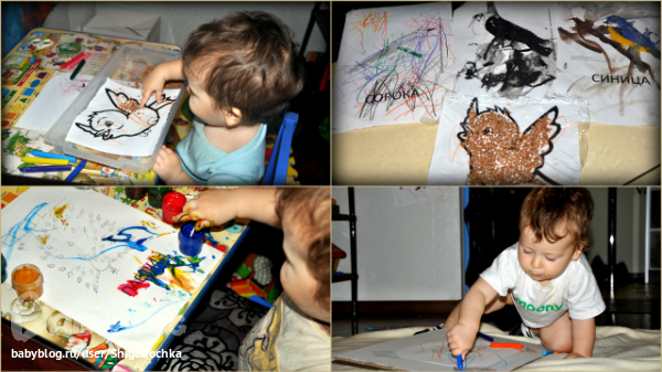 - а вот и наше творчество! Аппликация "Воробей", рисуем ватными палочками Павлина, еще первый раз сделала что то на подобие мольберта на полу, еще рисовали всем остальным - гуашью, мелками, пальчиками. Ну рисовать мы любим, поэтому стараемся каждый день. А лепили на этой недельке без прицела фотоаппарата - уточке (которая на полу рисуется) потом слепили пруд, и покормили, ну и курочек (из ШСГ).