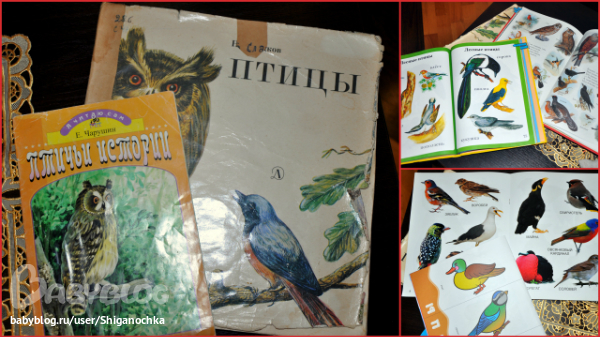 - эти книги были у нас основными (Ладушки, Моя первая книга, Мои блестящие птицы, Птицы Сладков, Чарушин Птичьи истории, ШСГ). По ШСГ еще лепили курочкам и цточкам зернышки, но это у нас часто, поэтому не фоткала. Плюс к этим книгам еще сборники стихов, в которых фигурируют птицы, искала прямо по огловлению.