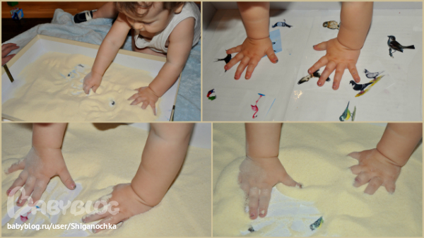- на стол с манкой наклеили птичек и искали их под слоем манки