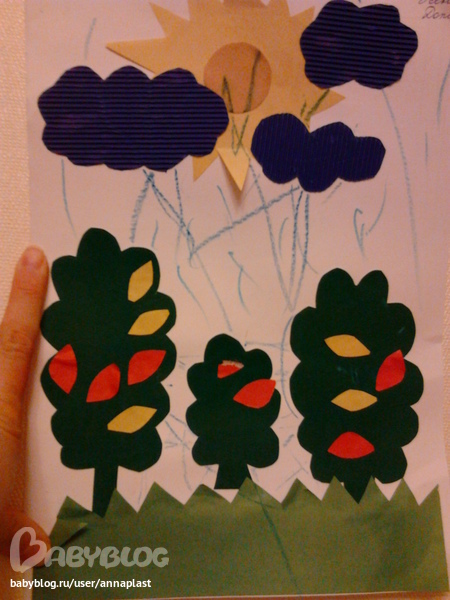 Занимались аппликацией. Маша намазывала клей и иногда помогало приглаживать аппликацию к бумаге. Потом рисовала дождь. Бумага разной фактуры: обычная, гофрированная и бархатная. Маша до сих пор подходит и трогает ручками:)