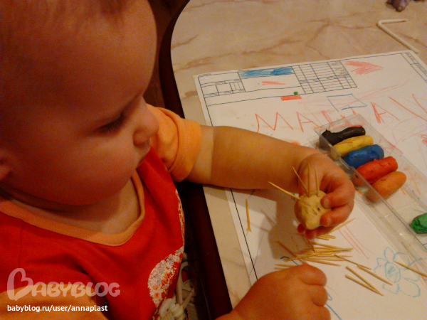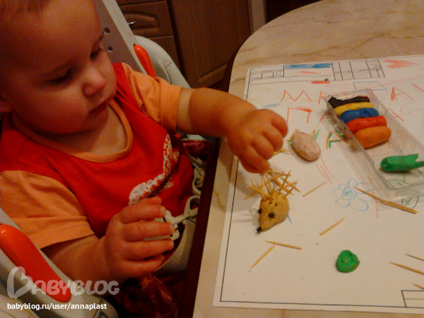 А сегодня закрыли неделю лепкой. Лепили ежиков под елочками. Маша сначала усердно втыкала колючки, потом так же усердно их доставала:)
