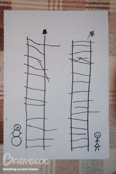 Сюжет такой: снеговичку нужно по лесенке подняться наверх за своим ведерком, а девочке - за цветочком. Тая должна была помочь им подняться наверх - нарисовать перекладинки для каждой лесенки.