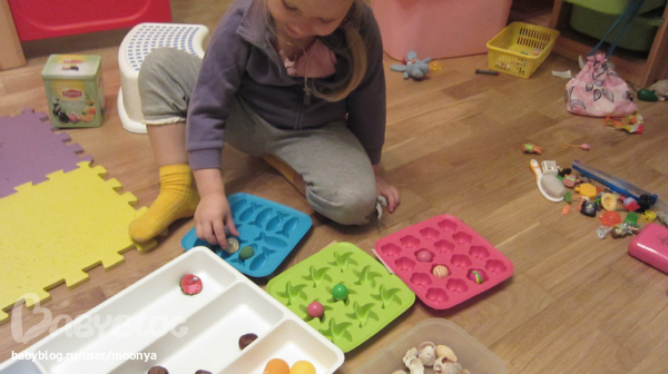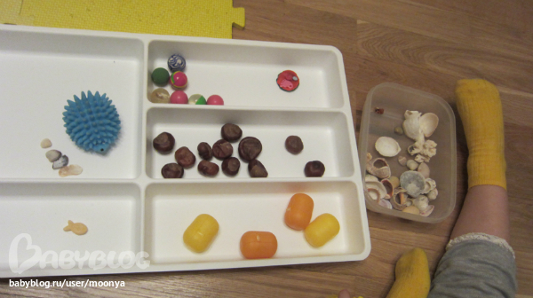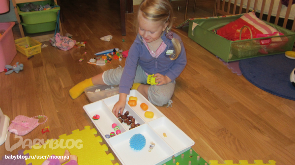 Открылся магазин в икеевской штуке для вилок, ложек. Ёж - продавец, тут у него конфеты-шарики, котлеты-каштаны, булочки-коробочки от киндера. Ракушки - это деньги. Я за продавца, говорила -дать три маленьких и одну большую денежку, например. Алиса тоже была продавцом. Тут немного математических знаний, на выделение определенного количества предметов из множества... (вчера Алиса упорно считала так - 1,5, 7... никак не 1,2,3...) - купила ей еще счеты:))