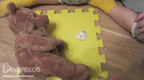 Укладывала малышей спать. По ходу игры приходили медведь, лиса, волк, шумели, пели песни, т. к. у них был праздник и будили малышей (это Алиса мне придумывала, а я по ее словам разыгрывала), мама-мышка вразумляла всех этих зверей. Потом приходил ежик, у которого сгорел дом, мыши его приняли к себе, т.к. оказались очень гостеприимными(Алиса учит это слово:)). Да, это какой-то прогресс, раньше игра разворачивалась по сюжету - не пускать, прогнать, повредничать, теперь решили всех потерпевших приютить в домике.