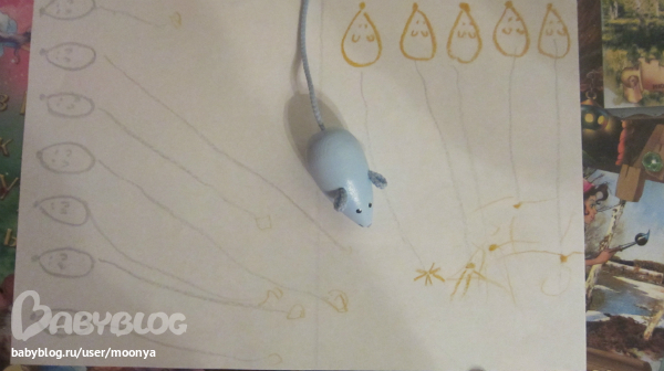 Тут все сама Алиса рисовала - мышь, две норы, дорога, волнистая линия изображает, как мышь бежала по дороге