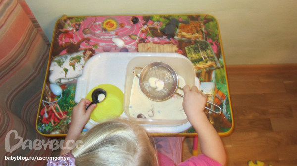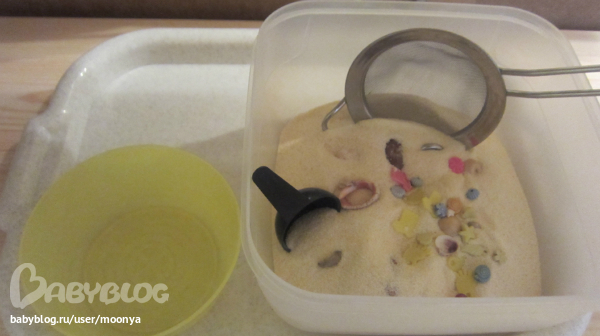 Вот просеивание - мышата играли в кладовке и набросали в манку всего разного, мама-мышка просит исправить.