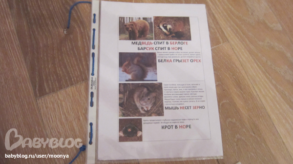 Это уже на следующий день. Сегодня:) Алиса получила письма из леса - такие листочки, с информацией о подготовке к зиме растений, зверей, птиц, насекомых... Это я составляла. На полянке ковре были собраны все наши лесные жители-игрушки и мы читали письма. Потом решили сделать из них книгу - вставили листы в файлы и Алиса сшила их шнурком. Вот лесная книга. "лесные письмЫ", как назвала их Алиса. Она была в восторге от них, изображала, что читает, рассказывала про всех этих животных, т. к. уже хорошо про них знает, что они там к зиме делают:) Все это перешло как всегда в игру с игрушками-животными, которые удивлялись, что вот про них тут написано. Смеялись