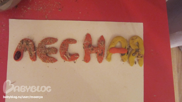 Буквы я лепила, Алиса катала колбаски, украсили фасолиной, травой ромашки, корой дуба (из аптечных коробок). На слово КНИГА нас не хватило. Надо было срочно поиграть в утреннюю игру с книгой и зверями. Также не удалось по этой же причине позаниматься с музыкальными инструментами. Пока Алиса захвачены темой писем, что вот они к ней из леса пришли:) и всем зверям надо показать.