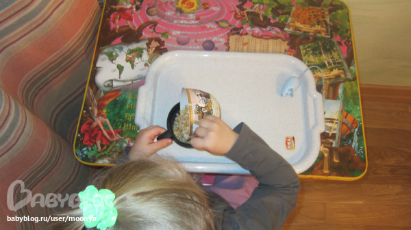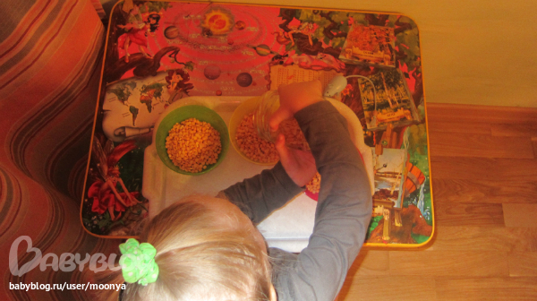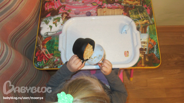 Игры и игрушки для ребят от 3 лет и старшеПродолжаем каждый день небольшие занятия по нашей теме. В контексте мышиной кладовой у нас появились еще задания на пересыпания, включающие работу двух рук (все время обращала внимание Алисы, что надо обоим ручкам помогать друг другу).