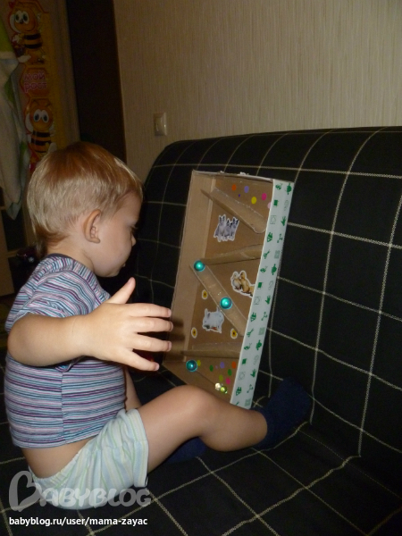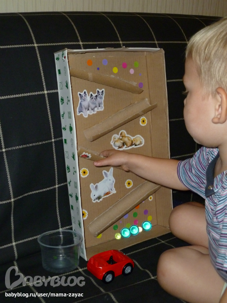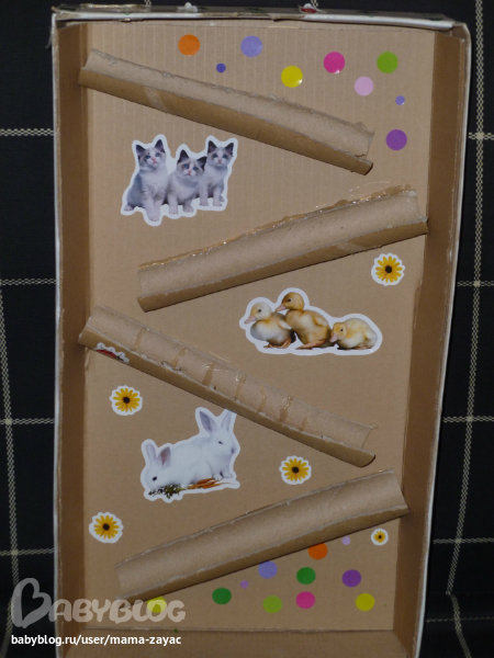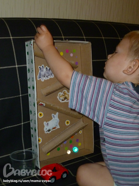 , которые постояно разлетались по разным углам. И случайно гуляя по просторам интернетана ткнулась на замечательный блок и там была игрушка из картона, что бы катать шарики. И захотелось такой же сотворить, и как раз отслось на балконе не выкинутые картоные коробки. И засела за труды и вот через 30 мин у меня была готова игрушка для сыночка, потом взяли наклейки и обклеили.