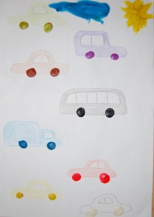 Мама нарисовала машинки, подбирали им пластилиновые колеса, подходящие по цвету. Все прошло отлично, но возникла сложность с белой (те попросту нераскрашенной) машиной