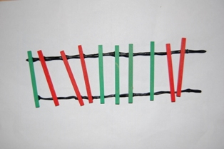 Сделали шпалы из счетных палочек, уложив их на заранее приготовленные пластилиновые рельсы