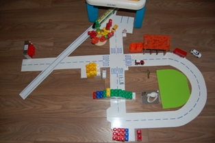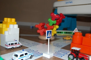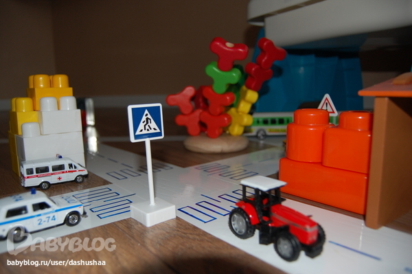 Еще несколько фото. Дороги сделали из клеящейся бумаги, оставшейся от ремонта. Из кубиков конструктора здание полиции и скорой помощи, мост. Зеленая площадка - парк, там гуляли кошка с собакой. в пруду плавали утка с утятами и лебедь. Автобус всех перевозил (останавлявается, конечно, на остановках), а папа напридумывал кучу историй: как у кошки заболело горлышко, к ней приехал доктор, как пропали утята и пришлось срочно звонить в полицию, как подул ветер, сломал дерево, пришлось вызвать дядю на тракторе, он разобрал завалы, как выстраивалась очередь на заправку, ездили в магазин.
