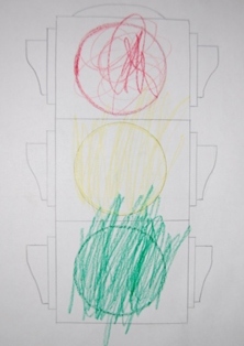 Конечно поговорили про светофор, раскрасили его. Первый раз Поля решила раскрасить "кругами" (красный круг)