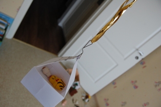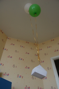 Немного с опозданием сделали воздушный шар: взяли гелевый шар, привязали к нему за веревочки "корзину", посадили полетать маленькую фигурку животного. Видела такую штуку у кого-то на ББ