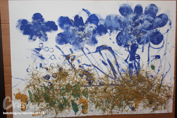 Тучи, дождь:рисование внутри трафарета губкой, грибочки с помощью картошки, капли с помощью макарон.