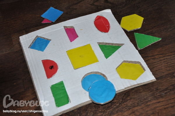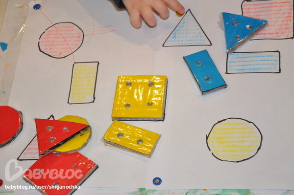 это недоделанный Геометрик. Опять же подсмотрено у . Как доделаю покажу. Фигурки эти из двойного картона + цветная бумана + скотч. А так как геометрик не доделан - играем пока так. У нас есть такая картонка для рисования, на нее удобно клеить скотчем или кнопками листок и рисовать на нем. Я ее использую, когда Костя рисует на полу, а не на столе (На стол я обычно тоже листок, точнее два, клеюприклеиваю скотчем, чтобы не сьезжал). На эту картонку прикрепила два листа а4 и на них нарисовала шаблоны под фигурки маркером, и раскрасила. Игра быстрая - поставить все фигурки на места. Но для разнообразия пойдет.