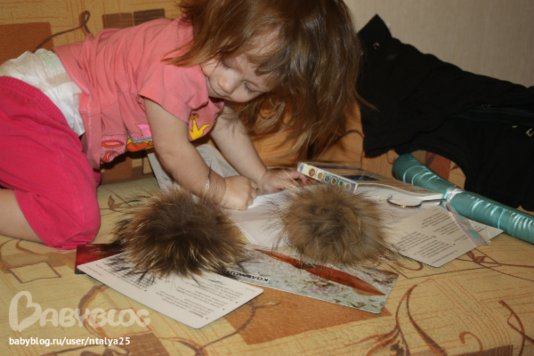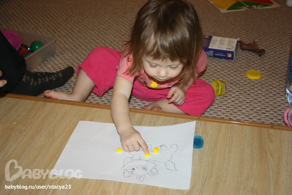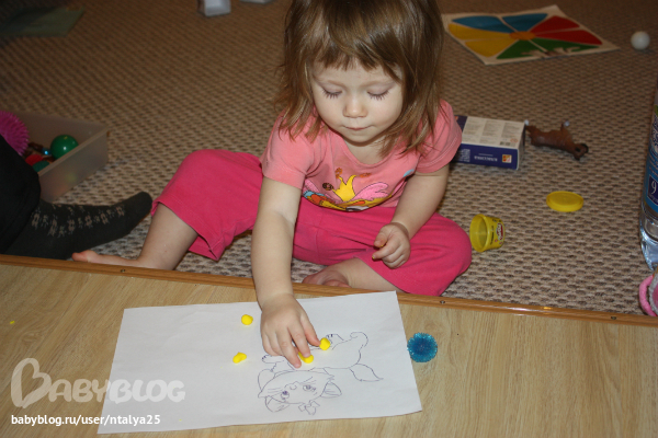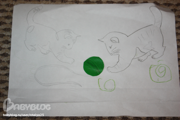 Так как наш папа, не распечатал нам раскрасски (за что был очень наказан, чтоб загладить вину, обещал нам купить принтер на этой неделе. уРА!), я сама рисовала кошечек, как получилось. Клеили клубок. Уже который раз замечаю, что Насте не нравится клеить, ей нравиться выкручивать клей и ковырять в нем пальцем. или отрывать, что приклеила мама и складывать в коробочку, потом доставать и снова складывать. Тут же и порисовали, клубочки. Насте дала карандаш и водила ее рукой.